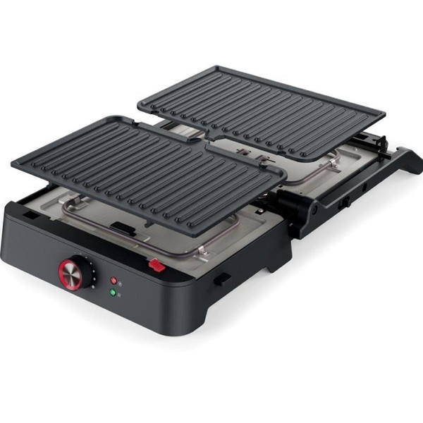 Placas desmontables - Abertura de 180ºTiene una superficie de cocción de 27,5 x 18 cm, termostato regulable y, gracias a su apertura de 180º, también puede utilizarse como parrilla de mesa. Al ser desmontables las placas, su limpieza después del uso es muy fácil. 1800 vatios de potencia.