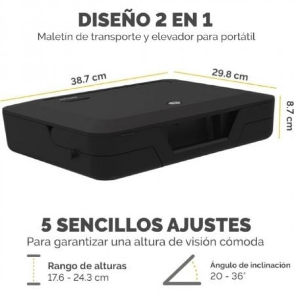 Maletín y Soporte elevador para portátil 2 en 1: permite colocar el portátil a la altura adecuada y guardarlo en su interior o poder transportarlo cuando no está en uso. 5 Configuraciones de altura. Diseño con estuche rígido compacto y ultraligero. Capacidad para portátiles de 14”, cargador y otros utensilios habituales. Asa integrada y correa de transporte extraíble. Fabricado con materiales 100% reciclables y duraderos, con garantía extendida de 5 años. Dimensiones (AnxProxAl): 38,7 x 29,8 x 8,7 cm. Peso 1,7 kg. Color negro