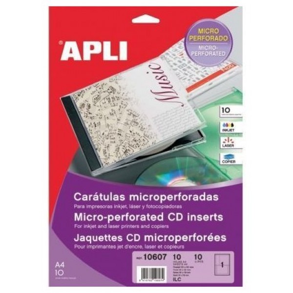 - Carátulas para CD/DVD de cartulina de 200 g/m² microperforada sin adhesivo. Tamaño frontal 121 x 121 mm y dorso 151 x 118 mm. Cada pack contiene 10 hojas (10 carátulas).
