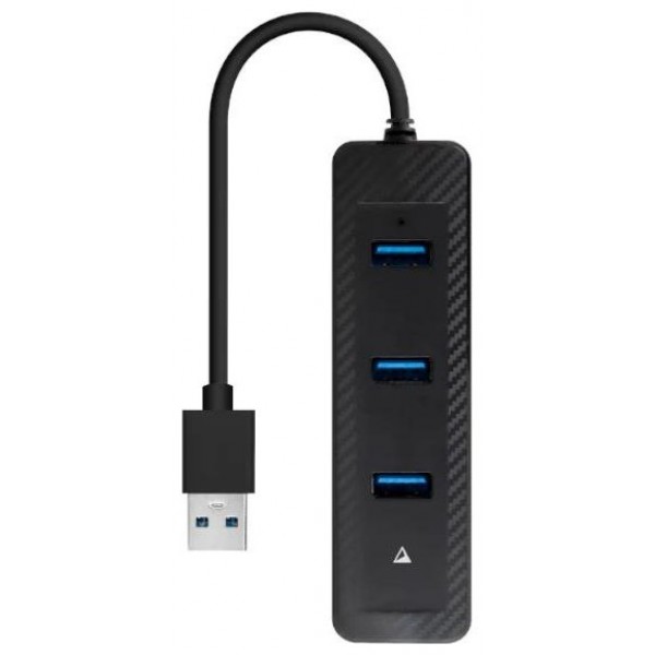 Hub USB-A 3.0 a 3 puertos USB-A 3.0 y Ethernet RJ45, con conector USB-A 3.0 macho en un extremo y 3 puertos USB-A 3.0 hembra y RJ45 hembra en el otro.