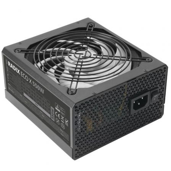 SILENCIO ABSOLUTO. AI-RPM Y 140MM FDB.. Equipada con la última tecnología en control de ventiladores AI-RPM ideal para garantizar un funcionamiento sin ruido, la RADIX ECO X 550 cuenta con control térmico inteligente de última generación basado en algoritmos avanzados y sistemas de control multinivel para mantener el ventilador al mínimo. Además, la RADIX ECO X 550 cuenta con un ventilador XL de 140mm con rodamiento de fluido dinámico y motor extragrande para maximizar su estabilidad. Toda la tecnología disponible para asegurar el mínimo ruido y la máxima eficiencia y durabilidad.. . TECNOLOGíA AVANZADA DE CONVERSIóN DC-DC. La tecnología de conversión DC-DC optimiza la eficiencia y garantiza una estabilidad y adaptabilidad excepcionales, protegiendo los componentes más sensibles. Incluso ante variaciones de carga, esta fuente ATX mantiene un rendimiento óptimo y una estabilidad del sistema en cualquier situación.. . EFICIENCIA PROFESIONAL. Con una eficiencia del 99% en el sistema DIGITAL APFC y un 87% de eficiencia eléctrica lograrás un perfecto equilibrio entre eficiencia y consumo. Además, su tecnología de raíl único +12v te permitirá instalar el hardware más exigente.. . DISEñO DE CABLES OPTIMIZADO. Los cables de la RADIX ECO X 550 son planos, negros y extralargos: una combinación de prestaciones que hacen su instalación no solo más fácil que nunca, sino además totalmente versátil para cualquier montaje en cualquier tipo de caja. Construye el PC definitivo con una torre de gran tamaño y disfruta de tus partidas a lo grande.. . Especificaciones:. . Potencia 550W. AC input 200-240V 50-60Hz. PFC Activo. Eficiencia >;87%. Ruido 12dB. Factor de forma ATX. Ventilador 140mm. Rail 12V unico. Certificaciones ATX12V, CE, ROHS, TUV. Protecciones OPP, OVP, UVP, SCP, OCP, OTP, OLP, SCP, NLO, PFP, TCP. Tipo de cables Fijos. Cables 1x 24 pin, 1x 12V 4+4 pin, 3x SATA, 2x MOLEX, 1x 6+2 pin PCI-E. Dimensiones 150x160x85mm / 1.35Kg. Tecnologia DC-DC, SMD. Extra Control Al-RPM del ventilador y cables planos extra largos