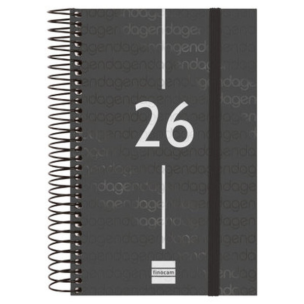 Agenda de espiral de estilo moderno. Con tapas ligeras de polipropileno y goma elástica. Ideal para uso personal y/o profesional. Esquinas microperforadas para localizar rápidamente el día/semana en curso. Agenda con información de interés en la anualidad y otros contenidos extra. Ideal para llevar contigo, compaginando los temas personales y profesionales. Duración: Enero 2026 - Diciembre 2026 (12 meses). Interior: 1 Día Página. Amplio espacio de escritura para cada día. Con horas. Con información de los festivos de España. La anualidad de la agenda incluye la información relativa a: onomástica, festivos nacionales, cambios de estación e inicios de los años nuevos chino, musulmán, ortodoxo y hebreo. La agenda dispone también de otros contenidos extra: datos personales, horarios, calendarios, planificación anual del año y del año siguiente, festivos internacionales, cómo buscar en Google, usos del teclado, mapa de Europa y de los husos horarios, hojas para notas y hojas para teléfonos, direcciones y e-mails. Idioma del artículo: español. Formato: E5 - 117x181 mm. Tapas de polipropileno, espiral simple metálica y papel. 70 g/m². Papel FSC®.