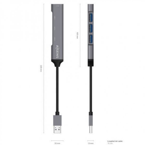AISENS - HUB USB 3.0 ALUMINIO, TIPO A/M-4xTIPO A/H, GRIS, 10CM