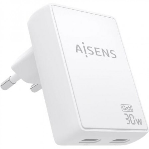 AISENS - CARGADOR DE PARED GaN ULTRA DELGADO 30W, 2xUSB-C PD3.0 QC4.0, BLANCO
