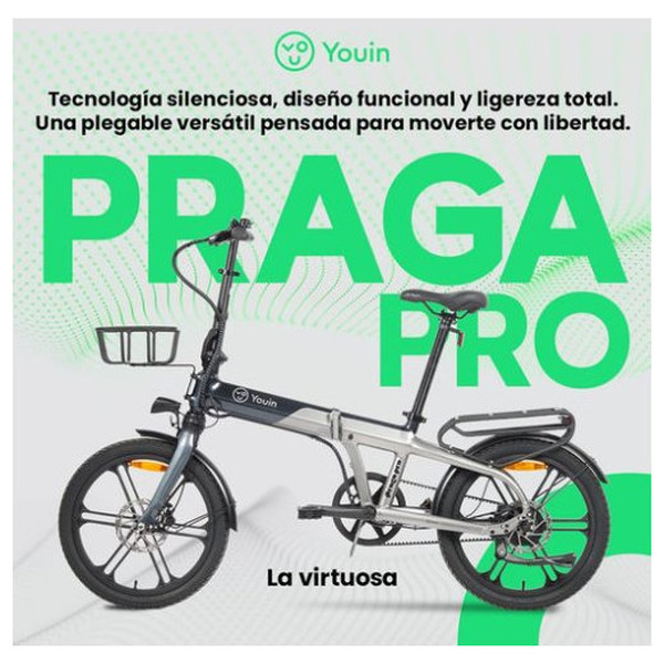 Youin-e-bike-20-youin-praga-p. Con frenos hidráulicos que ofrecen un control de frenada extremo incluso en situaciones de alta exigencia, mientras que la velocidad única simplifica el uso diario y elimina mantenimientos habituales. La batería integrada y extraíble facilita la recarga y, con autonomía real certificada de hasta 60km, responde a desplazamientos urbanos intensos sin preocupaciones de quedarse sin energía. La pantalla a color proporciona información precisa de velocidad, nivel de batería y modos de asistencia, esencial para quienes exigen datos claros en tiempo real. El montaje simplificado al 95% elimina frustraciones habituales tras la compra, aportando una experiencia de usuario premium. Incluye elementos prácticos de serie: cesta delantera, portabultos trasero y red nacional de talleres con recambios originales en España, para una postventa de confianza difícil de encontrar en el mercado e-bike. Perfecta para usuarios que buscan tecnología, robustez y soporte europeo real, la Praga Pro BK1850 garantiza calidad, diseño y fiabilidad en cada trayecto. Atrévete a reimaginar tu movilidad y aprovecha el auténtico valor de una bicicleta eléctrica FAT plegable profesional.