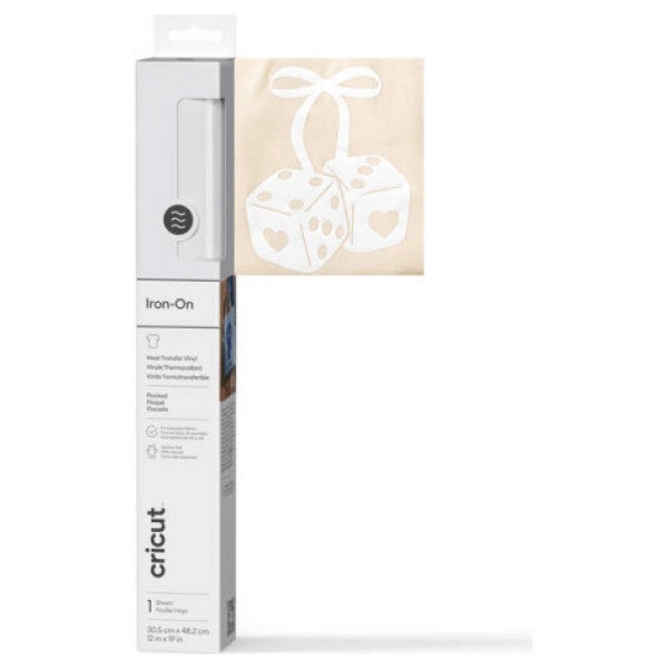 Cricut 2011789. Tipo de producto: Rollo de vinilo de termotransferencia, Tipo: Vinilo de termotransferencia liso, Color del producto: Blanco. Ancho: 305 mm, Longitud: 483 mm. Tipo de embalaje: Envase para colgar