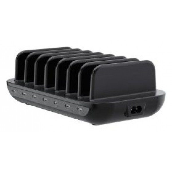 Con un formato compacto y robusto, esta estación de carga se adapta perfectamente a escritorios profesionales o espacios compartidos. Su diseño ayuda a mantener los cables organizados y minimiza el desorden, todo en un acabado sobrio de color negro.