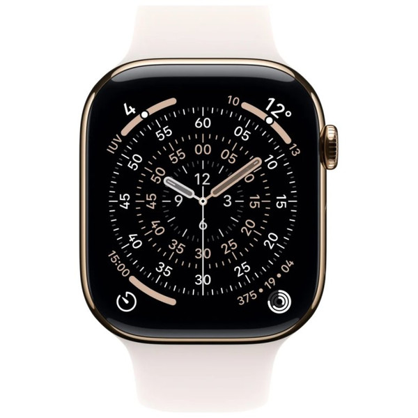 - Tamaño y peso: Alto: 46 mm, Ancho: 39 mm, Grosor: 9,7 mm, 416 x 496 píxeles, Superficie de pantalla de 1.220 mm², Peso (aluminio, GPS): 37,8 g, Peso (aluminio, GPS + Cellular): 36,9 g, Peso (titanio): 43,1 g, Para muñecas de 140 a 245 mm