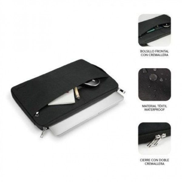 Especificaciones:. . • Funda para ordenadores de hasta 15,6″. • Ideal para el transporte diario de tu dispositivo. • Bolsillo con cremallera frontal y compartimentos interiores para el transporte de accesorios. • Cierre con doble cremallera para una protección total. • Exterior de la funda fabricada con tela de poliéster 600D a prueba de líquidos y otros elementos. • Interior acolchado con relleno de Foam de doble capa. • Asa de mano lateral retráctil. • Compacta e ideal que ofrece un cómodo acceso a tu ordenador. • Apariencia liviana y delgada a la vez que elegante.