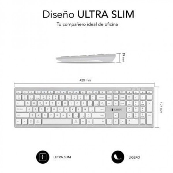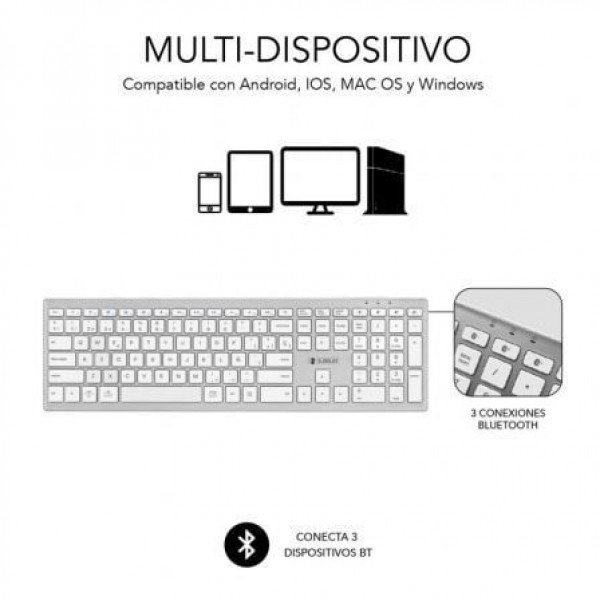 Especificaciones:. . Teclado completo ultra delgado con conectividad Bluetooth de última generación 5.1. Diseño ideal para espacios reducidos sin perder productividad gracias al teclado numérico incorporado. Compatible Android, IOS, MAC OS y Windows. Multi-dispositivo. Tablet, Smartphone, Laptop, Consolas o TV con conexión Bluetooth. Conecta hasta 3 dispositivos Bluetooth de forma sencilla. Teclado en Español con 110 teclas tipo Chiclet de alta precisión. Funcionamiento mediante Pilas (recomendamos el uso de Alcalinas)