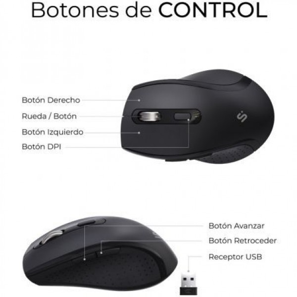 Ratón Ergo Inalámbrico. El pack se completa con un ratón ergonómico, pensado para adaptarse a la perfección a la mano derecha. Dispone de botones laterales de “Avanzar” y “Retroceder” y un tacto suave con clic silencioso. Además, puedes ajustar su DPI entre 800/1200/1600/3200 para obtener la sensibilidad y precisión que mejor se ajuste a tu estilo de trabajo o juego.