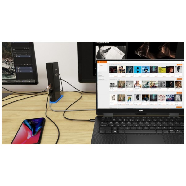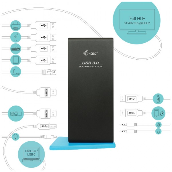 Estación de almacenamiento universal que se puede usar prácticamente con cualquier notebook, ya que se puede conectar con cualquier puerto USB (USB 3.0, USB-D, Thunderbolt 3, o hasta con el puerto USB 2.0 más antiguo).La estación soporta hasta 2 monitores externos que se conectan por medio de puertos HDMI. 6 puertos USB, conexión fiable y rápida con el internet, gracias al integrado puerto LAN, sin que falte el soporte de la salida y entrada de audio.La estación de almacenamiento se puede instalar en la posición vertical (exige menos espacio en la mesa de trabajo), u horizontal – en tal caso, puede servir de base cómoda de su notebook.